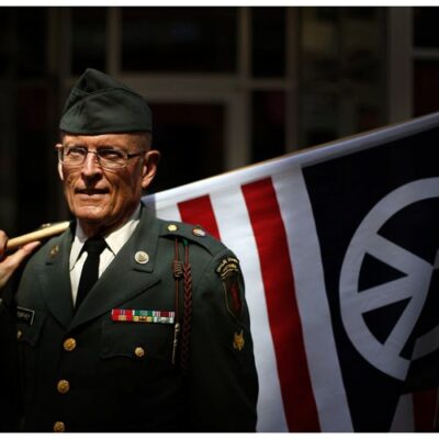 Several people, mostly men, reached out to shake my hand and thank me for my service. Many who kept walking by expressed their appreciation for my army service, even if they did not like my flag, with one woman thanking me for my “sacrifice.” That’s a bit much, I thought, as I hadn’t lost an arm or a leg in Vietnam. I said to one woman while we shook hands–who was very grateful for my message–“Isn’t it funny that those who shout the loudest for war have never been in one? What a funny coincidence.” She smiled in agreement.